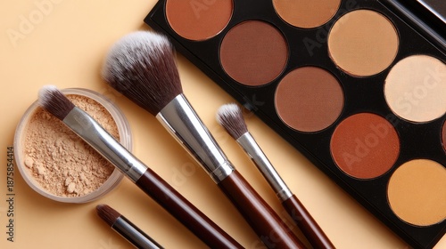 Professional Makeup Brushes with Powder and Contour Palette Flat Lay Beauty Concept