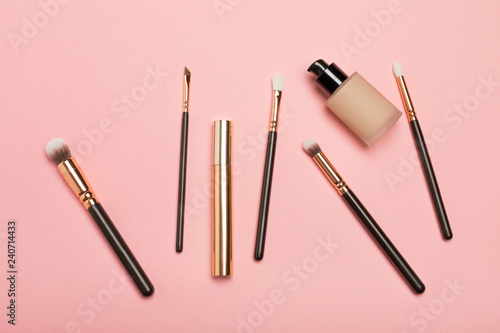 Professional makeup products with cosmetic beauty products, blushes, eye liner, eye lashes, brushes and tools on pink background