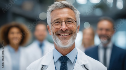 Professional male doctor with gray hair and beard smiling confidently in a medical team at a hospital or healthcare facility