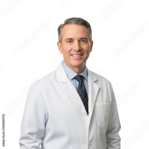 Professional male physician wearing white lab coat and tie smiling confidently isolated on transparent background