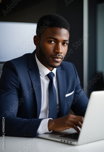 professional man, business suit, working on laptop, office setting, focused expression, modern and sleek environment, natural lighting, depth of field, sharp focus, corporate atmosphere