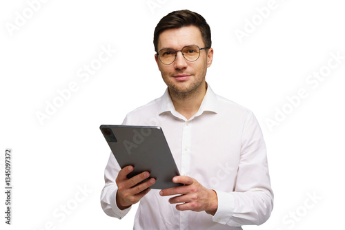 Professional man holding a tablet while wearing glasses in a white shirt indoors