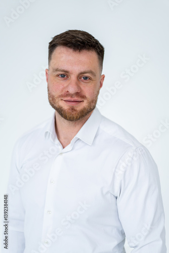 Professional man in white shirt posing. A man stands confidently in a white button-down shirt against a plain background, looking directly at the camera.
