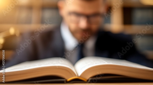 Professional man reading a book, thoughtful middle-aged individual in a suit, warm light background, perfect for academic themes.
