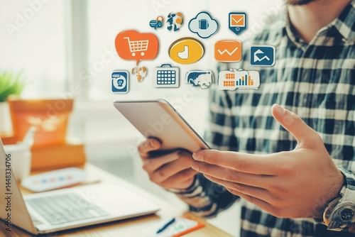 Professional man using a tablet in a modern office, surrounded by digital icons and tools