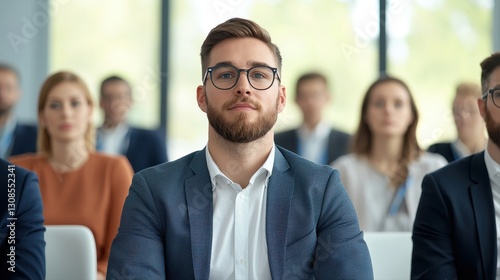 Professional man with glasses leading a group of people in a business meeting focused on technology concepts