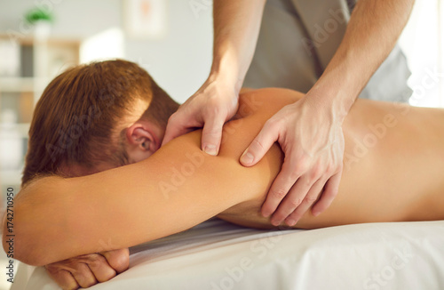 Professional masseur massaging the tanned shoulders of a relaxed young man lying on a massage table in the clinic room. Hands on the shoulder close up. Body massage concept