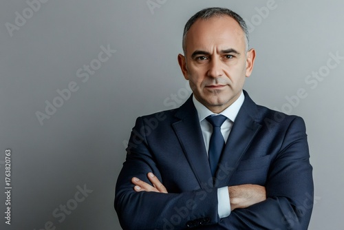 Professional middle aged man in a dark business suit with a tie standing seriously against a grey background