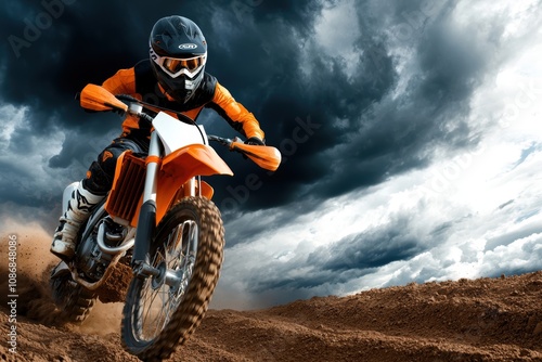 Professional motocross racer kicking up dirt on rugged track under dark cloudy skies extreme sport action with dynamic motion focus
