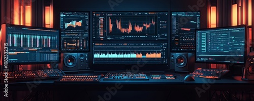 Professional music editing studio with multiple screens showing audio tracks and sound waves, advanced audio mixers, creative workspace for music production and editing