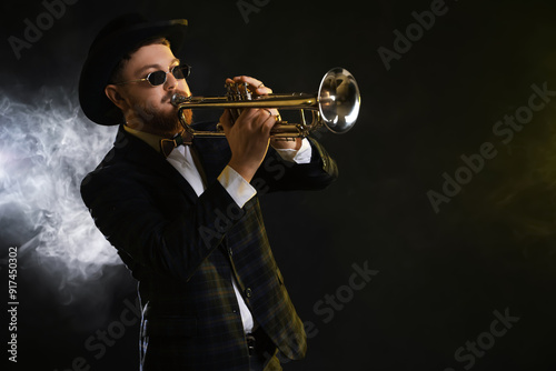 adult, art, artist, background, black, blowing, blues, brass, caucasian, classic, concert, copy, entertainment, equipment, festival, goggles, guy, photogenic, hat, hobby, instrument, jazz, lifestyle, male, man, melody, metal, music, musical, musician, occupation, orchestra, performance, performer, person, player, playing, portrait, professional, smoke, sound, space, style, symphony, talent, text, trumpet, trumpeter
