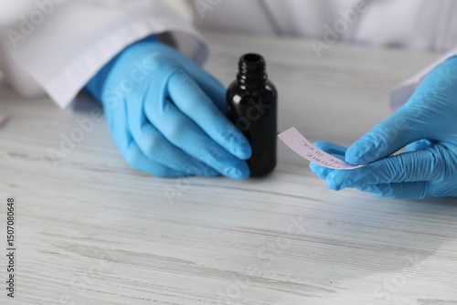 Professional perfumer developing luxury perfume at white wooden table in laboratory, closeup