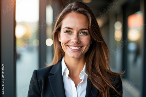 Professional Portrait of a Smiling Caucasian Woman in Business Attire Outdoors, Capturing a Confident Expression in a Modern Urban Setting