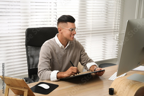 Professional retoucher working on graphic tablet at desk in office