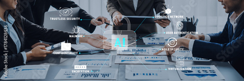 Professional team collaborates on data analysis, integrating cybersecurity elements like user authentication and malware protection, enhancing business strategies and safety. Trope