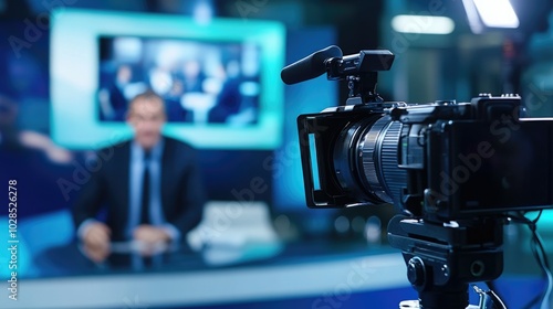 Professional TV Camera Standing in Live News Studio with Anchor seen in Small Display. Unfocused TV Broadcasting Channel