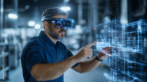 Professional using augmented reality (AR) glasses in an industrial setting, visualizing complex machinery and systems in real-time, showcasing the advanced use of AR technology in