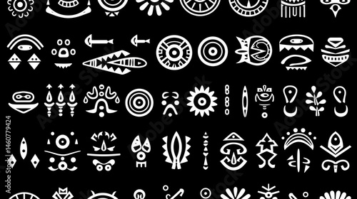 Professional White Tribal Elements and Ethnic Patterns on Black Background for Graphic Design Projects
