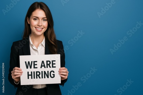 hiring, recruitment, job, opening, professional, woman, formal, attire, smile, background, blue, office, employment, career, search, workplace, signs, opportunity, message, business, advertising, candidate, skill, resume, interview, applicant, team, work, potential, announcement, niche, service