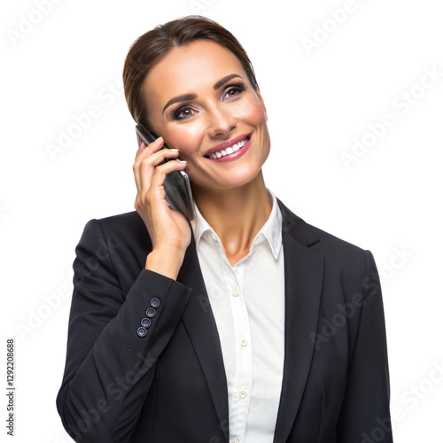 Professional woman in business attire engaged in phone conversation at office space, isolated on white or transparent background