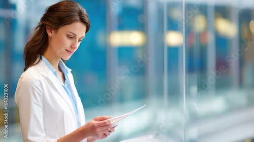 Professional woman reviewing documents modern office portrait bright environment close-up focus on career growth