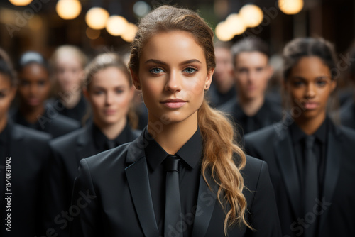 Professional Women in Business Suits Standing Together in Workplace Setting