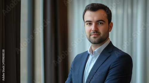 Professional young businessman posing confidently in a modern office setting with natural light illuminating the scene.