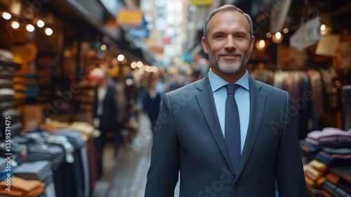 professionally dressed man stands in a crowded marketplace with colorful clothing stalls and shoppers in the background, embodying a confident presence amid the activity of the day