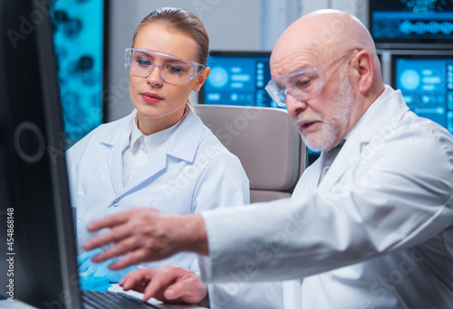 Professor and doctor work in a modern scientific laboratory using equipment and computertechnologies. Group of scientists make research and develop new vaccines. Science and healthcare concept.