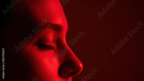 face, profile, red, light, emotion, expressive, mind, graceful, reflective, serene, sensual, contemplation, pure, meditation, mouth, soul, darkness, intense, glow, smooth