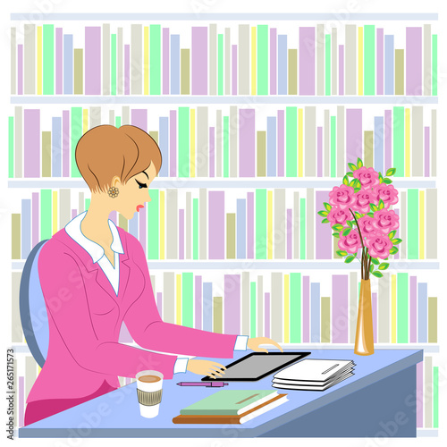 library, lady, professional, girl, blouse, book, bouquet, business, businesswoman, cabinet, career, chair, clever, computer, costume, cupboard, cute, desk, educated, education, female, feminine, coiffure, cognition, laptop, librarian, notebook, office, pen, profile, read, science, service, shapely, shelf, silence, sitting, skirt, slender, study, table, vase, vector, woman, work, write, writer, young, beautiful