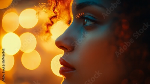 woman, profile, portrait, face, curly hair, bokeh, light, warm, soft, glow, artistic, dreamy, closeup, beauty, feminine, mood, atmosphere, eye, lip, skin, hair, style, elegance, serene, model, fashion, romantic, sensual, aethereal, gold, blurred, depth of field, nostalgia, retro, vintage, colours, contrast, female, adult, grace