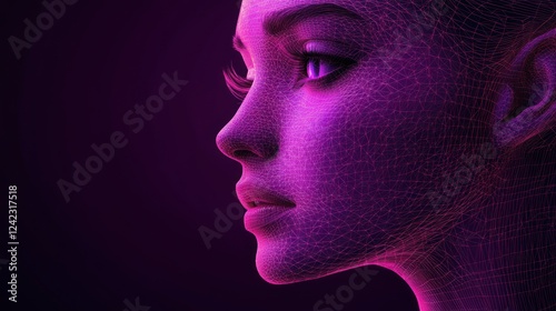 woman, face, profile, wireframe, mesh, grid, network, neon, pink, purple, magenta, light, dark, background, beauty, model, female, art, digital, graphic, design, abstract, futuristic, technology, science, concept, illustration, portrait, style, render, three-dimensional, image, vision, elegant, attractive, feminine, modern, contemporary, stylish, glow, shadow, line, structure, texture