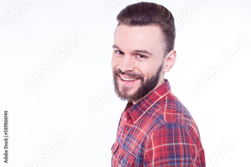 Profile or side view portrait of handsome young bearded stylish man in checkered shirt isolated over white background