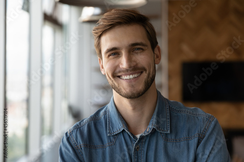 Profile picture of smiling successful young Caucasian businessman or boos look at camera pose in office. Headshot portrait of happy millennial male employee at workplace. Employment, hr concept.