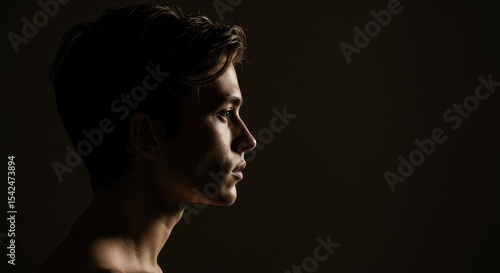 profile, portrait, young, person, male, light, shadow, dark, contrast, side, face, closeup, head, shoulder, expression, calm, serious, sharpened, studio, photo, image, lighting, sharp, silhouette, tone, dramatic, natural, hair, coiffure, body, shoulder, neck, straight, youth, modern, elegant, artistic, style, fashion, detail, form, beauty, composition, monochrome, grey, black, background, blank
