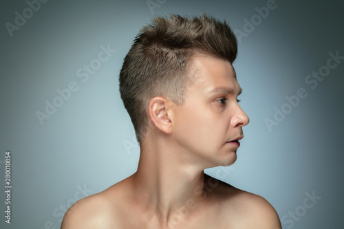 Profile portrait of shirtless young man isolated on grey studio background. Caucasian healthy male model looking at side and posing. Concept of men's health and beauty, self-care, body and skin care.