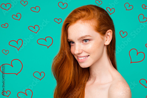 Profile side close-up portrait of nice cute nude sweet tender lovely adorable red-haired girl with shiny pure clean fresh smooth flawless skin, isolated over green turquoise background