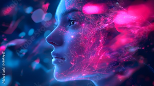 Profile view of a woman's face with pink and blue neon light effects around it