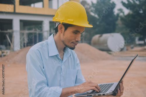 Project Engineering construction use computer notebook working on site management