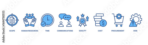 Project management banner web icon vector illustration concept with icon of scope, human resources, time, communication, quality, cost, procurement, and risk
