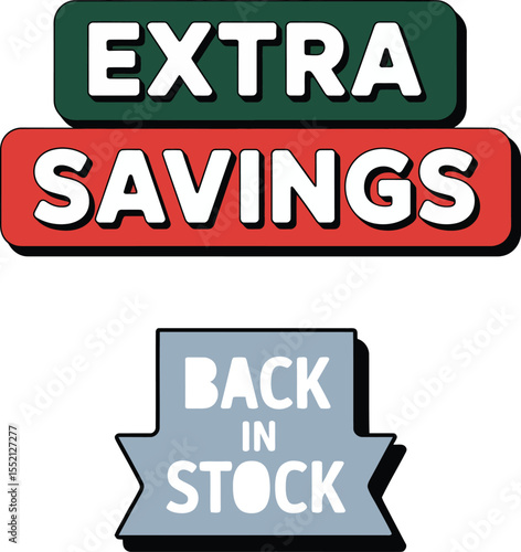 Promotional Signage Featuring Extra Savings and Back in Stock Messages for Retail or E-commerce Sales