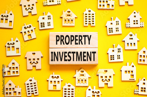 Property investment symbol. Concept words Property investment on beautiful wooden blocks. Wooden model of houses. Beautiful yellow background. Business Property investment concept. Copy space.