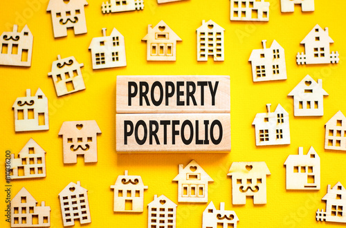 Property portfolio symbol. Concept words Property portfolio on beautiful wooden blocks. Wooden model of houses. Beautiful yellow background. Business Property portfolio concept. Copy space.