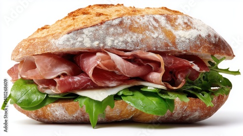 Prosciutto sandwich on rustic bread close up studio shot featuring arugula cheese and cured ham on white background