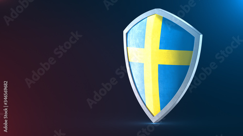 Protection shield and safeguard concept. Shiny steel armor painted as Swedish national flag. Safety badge icon. Privacy banner. Security label and defense sign. Force and strong symbol. 3D rendering