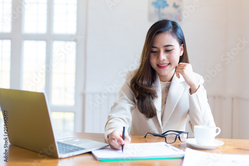 Protrait of Beautiful businesswoman sitting at desk and working with laptop computer.