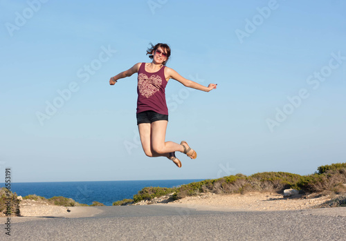 leap, woman, road, sea, energetic, vacation, happiness, sporty, happy, summer, fly, fun, spring, move, move, woman, life, people, sky, independent, foot, landscape, nature, hand, light, liberty, blue, laugh, sun, happy, contentment, pleasure, smile, fitness, man