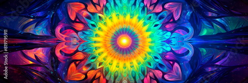 psychedelic geometric mandala, intricate repeating patterns, vivid rainbow palette, hypnotic background