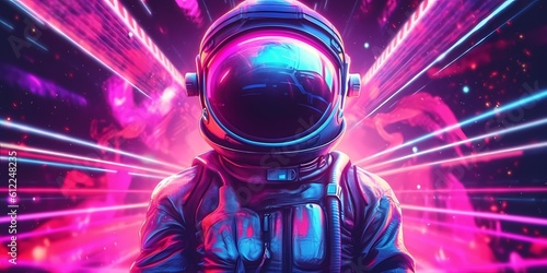 Psychedelic Retro Wave Astronaut in Neon Tubes Light. Pink Blue Violet Trendy Colors. Front View of a Space Suit. Generative Ai.